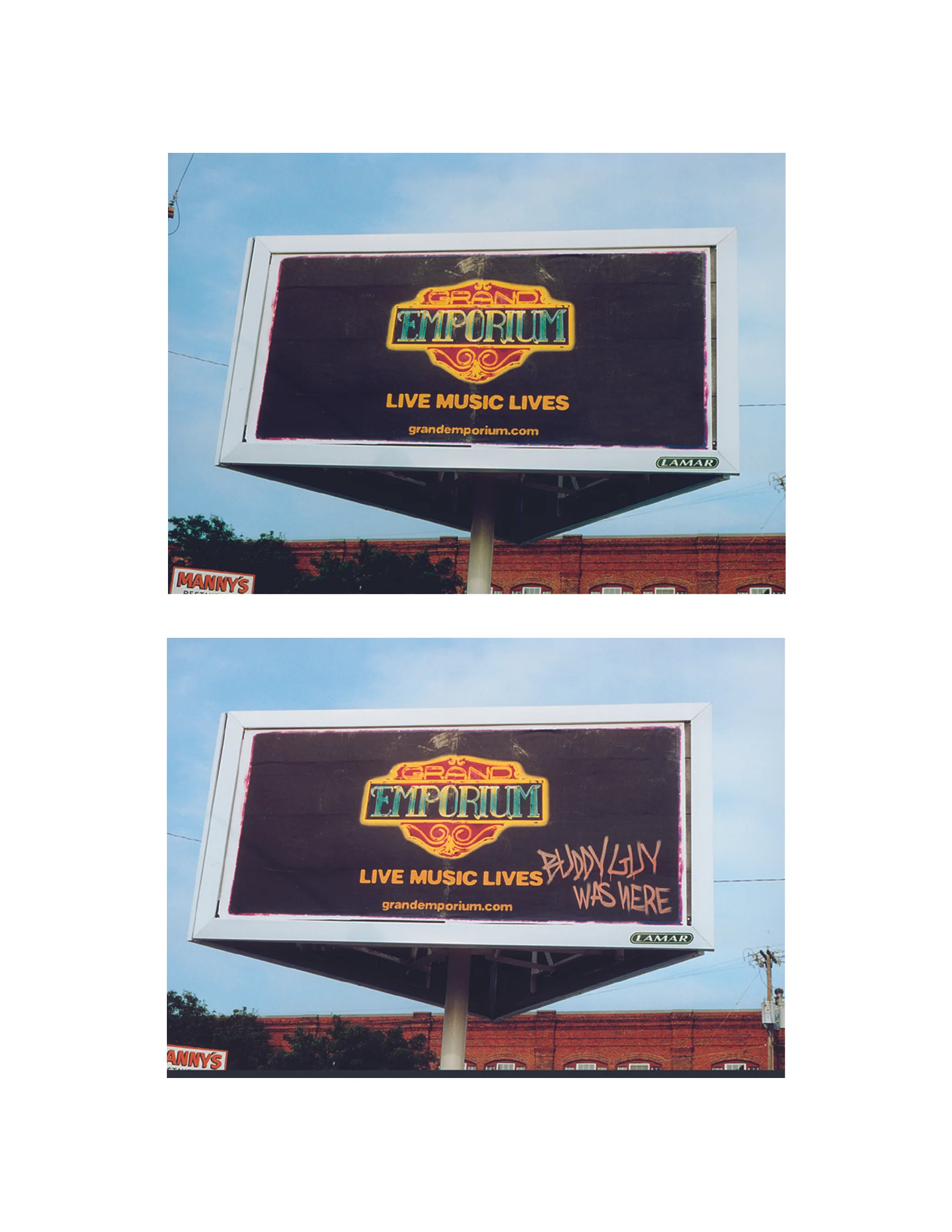 The Mid-West Blues Hall of Fame. Or shall we just say the Grand Emporium. This live music venue has heard some of the most renowned names in the business including John Lee Hooker, Buddy Guy and Stevie Ray Vaughn. This outdoor campaign featured the logo only board for two weeks. Then, we spray painted artist's names as graffiti to suggest that the artist had been there. (Actually, Stretch painted it.) Surprise. Instant creditability to the little club that could. Bravo Roger Naber.